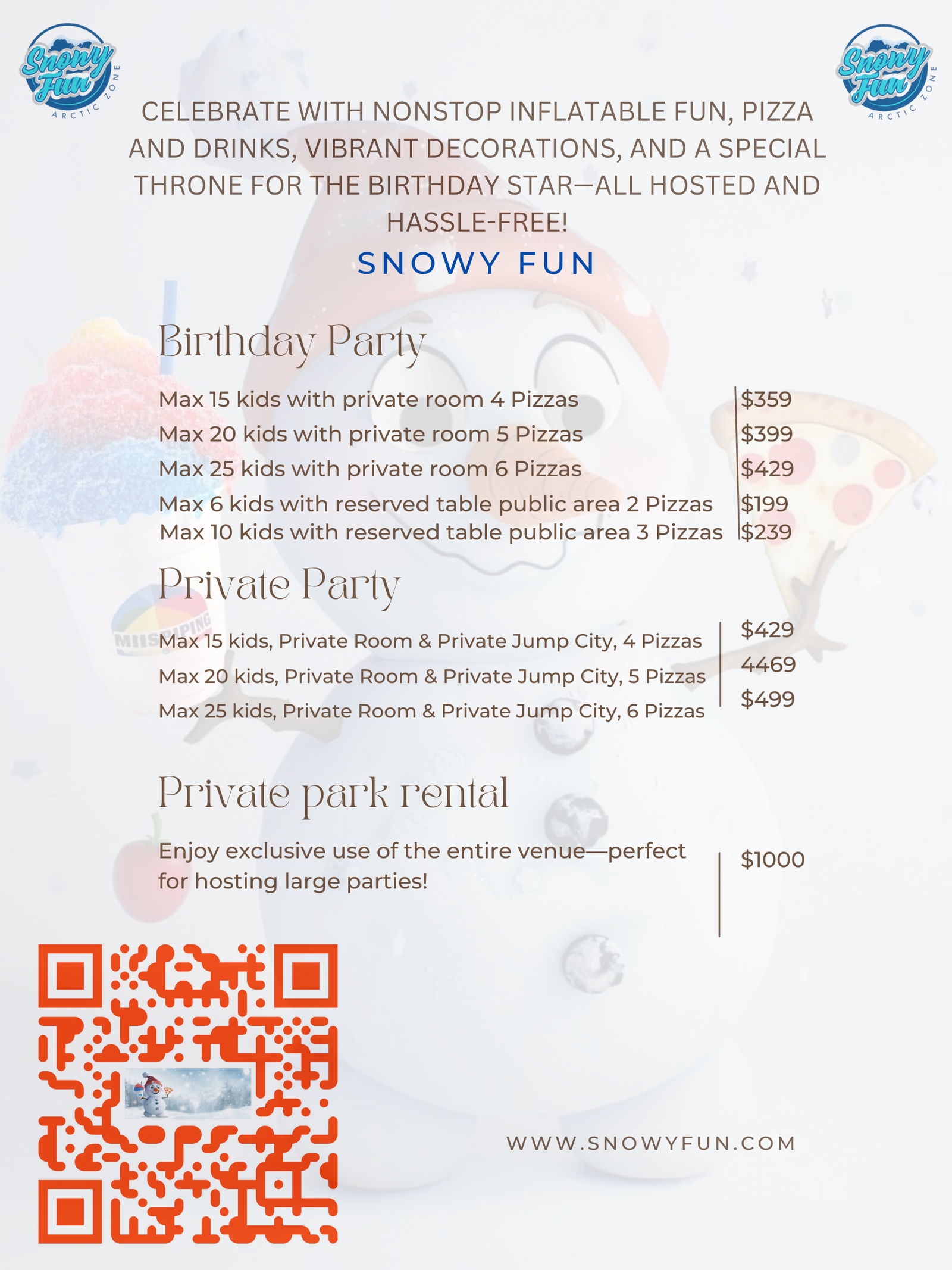 Enhance the celebration with exciting add-ons like a meet-and-greet with our mascot, Snowy, custom decorations, or themed goodie bags to give your child a party they’ll cherish forever. Here are our available add-ons: