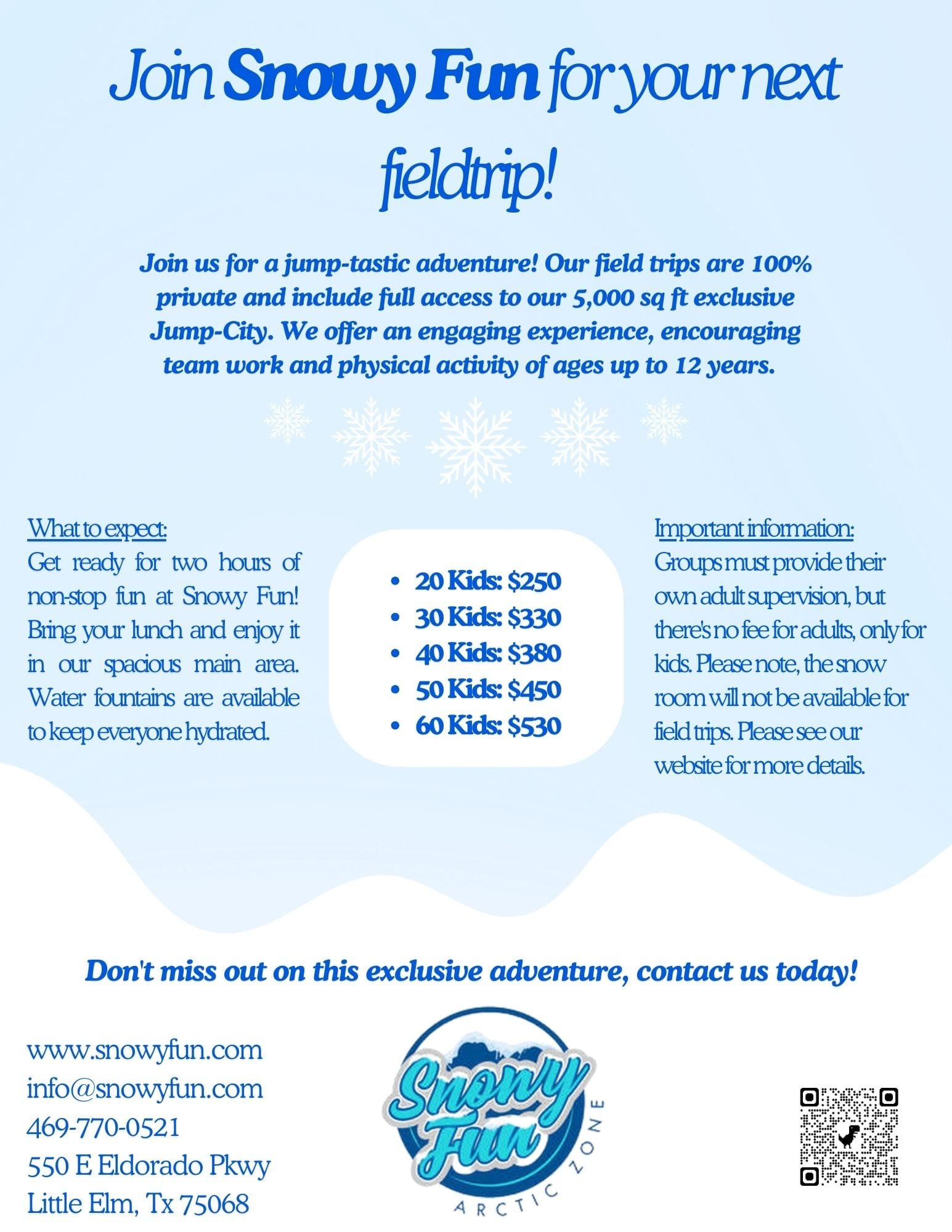 Visiting groups are expected to provide their own adult supervision while at Snowy Fun. There is no admission fee for supervising adults, making it an easy and enjoyable outing for everyone involved. Let us provide a memorable and fun experience for your group!